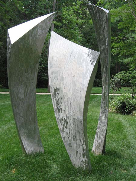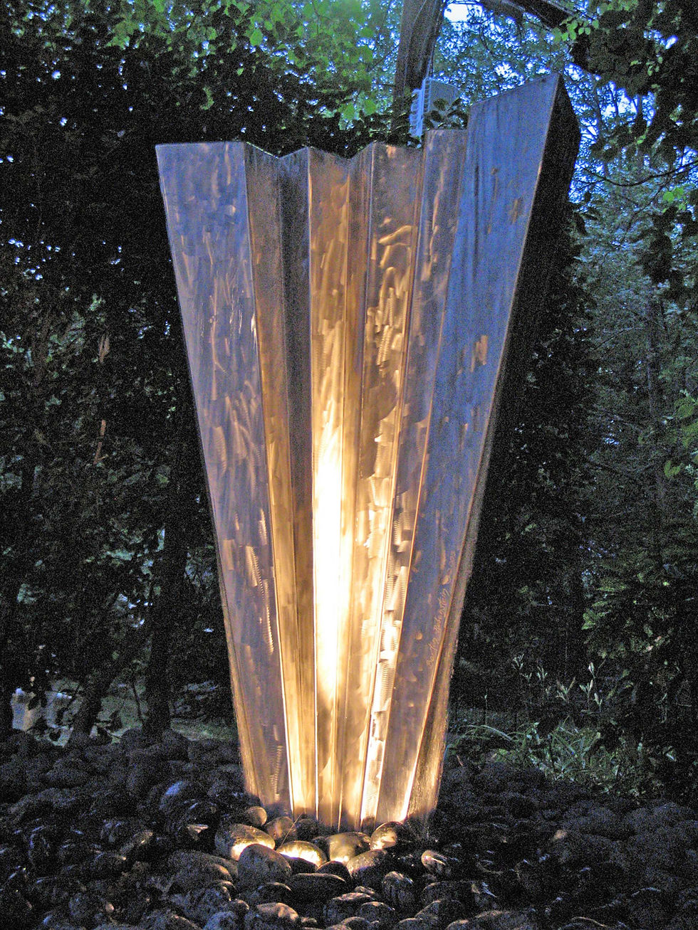 Ray of Light, was commissioned for Flats 8300 in Bethesda, MD, and the Redwood Shores Library in Redwood City, CA, following a national competition. Crafted with strong vertical lines that fan upwards and outwards, the water sculpture mimics light rays, enhancing its presence within its surroundings. Water cascades over its upper edges and flows down its articulated surfaces, which are finished with a brushed technique that catches and reflects light, creating a brilliant, shimmering effect.